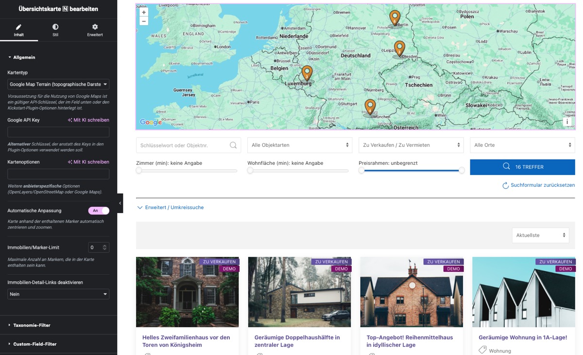 • Unterstützt die grundlegenden Frontend-Komponenten von Kickstart – Immobilienlisten- und Detailansichten, Suchformular, Galerien für Bilder und Videos, Karten, 360°-Touren …